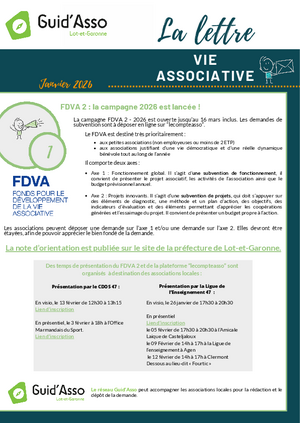 Vous trouverez ci-joint la lettre de la vie associative (Janvier 2026) proposé par le Service Départemental de la Jeunesse, de l'Engagement et des Sports (SDJES) !